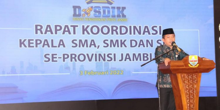 Inilah Jambi – Gubernur Jambi, Dr.H.Al Haris,S.Sos.,M.H., menyatakan, Pemerintah Provinsi Jambi melalui Dinas Pendidikan Provinsi Jambi terus berupaya dalam melaksanakan pemerataan pendidikan yang berkualitas di Provinsi Jambi. Hal tersebut dinyatakan Al Haris saat memimpin secara langsung Rapat Koordinasi Satuan Pendidikan Menengah dan Khusus, Kepala Sekolah SMA, SMK dan SLB se Provinsi Jambi, yang berlangsung di Auditorium Rumah Dinas Gubernur Jambi, Kamis (03/02/2022).