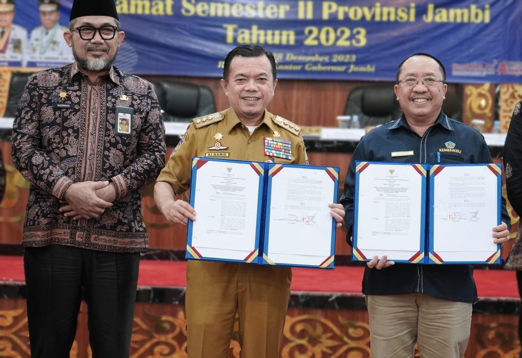 Gubernur Al Haris memaparkan kondisi makro ekonomi Provinsi Jambi dan kabupaten/kota se-Provinsi Jambi. Berdasarkan data Badan Pusat Statistik, pertumbuhan ekonomi Provinsi Jambi terus meningkat. Pertumbuhan ekonomi Provinsi Jambi pada tahun 2020 minus 0,44 %, pada tahun 2021 menjadi positif 3,66 %, dan laju pertumbuhan ekonomi Provinsi Jambi dilihat dari Year on Year pada Triwulan III Tahun 2023 sebesar 4,90%. “Dalam situasi dunia dan kondisi cuaca yang semakin tidak menentu, alhamdulillah, berkat sinergisitas dan kolaborasi semua pemangku kepentingan, laju pertumbuhan ekonomi Provinsi Jambi terus mengalami kenaikan positif,” papar Gubernur Al Haris.