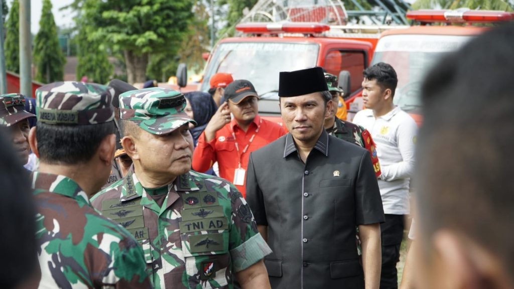 Inilah Jambi – Ketua DPRD Provinsi Jambi, Edi Purwanto mendampingi Kepala Staf Angkatan Darat (Kasad) Jenderal TNI, Dudung Abdurachman dalam kegiatan gelar personel dan perlengkapan Satgas Karhutla di Lapangan Makorem 042/ Gapu, Kamis (7/9).