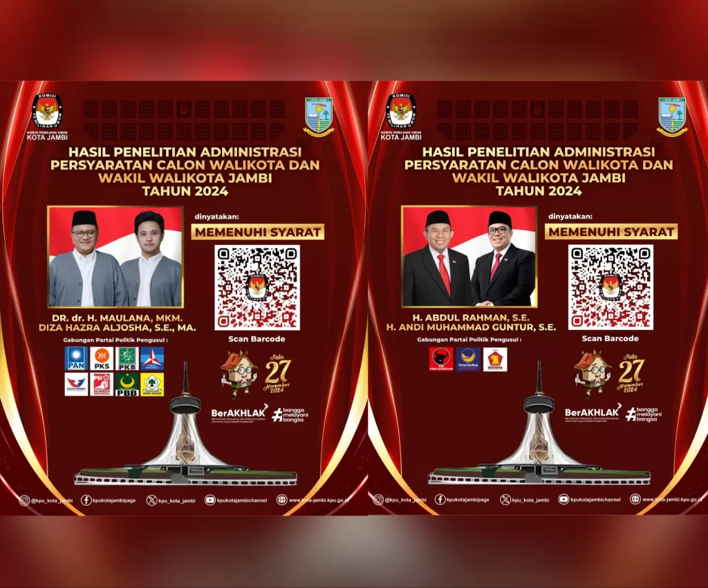 Selanjutnya, usai melewati sejumlah proses KPU Kota Jambi mengumumkan bahwa penelitian syarat administrasi calon Wali Kota dan Wakil Wali Kota Jambi, dua pasangan yakni Maulana dan Diza Hazra Aljosha Hazrin dinyatakan memenuhi syarat.
