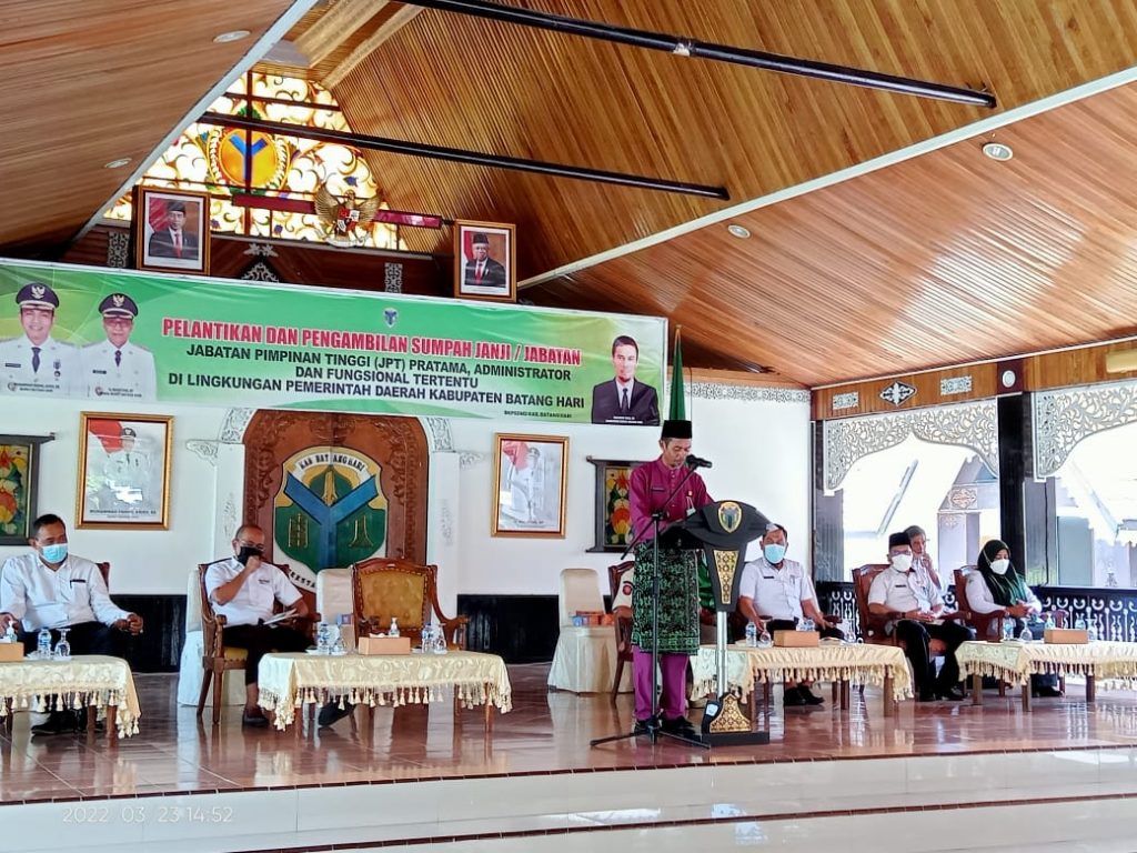 Inilahjambi.com Pemerintah Kabupaten Batang Hari kembali melantik serta laksanakan pengambilan sumpah jabatan kepada para pejabat Jabatan Pimpinan Tinggi (JPT) Pratama, Administrator dan Fungsional tertentu dalam lingkup Pemerintah Daerah Kabupaten Batanghari. Rabu, (23/03/2022) tepatnya bertempat di Pendopo Rumah Dinas Bupati Batang Hari.
