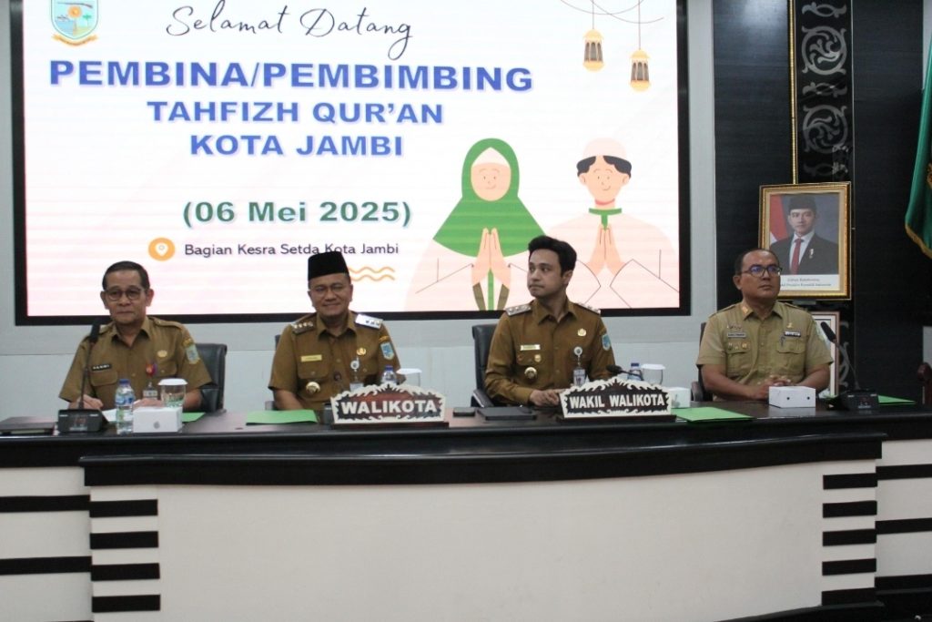 Wali Kota Jambi, Dr. dr. H. Maulana, MKM, bersama Wakil Wali Kota Jambi, Diza Hazra Aljosha, SE, MA, menggelar rapat bersama puluhan guru tahfiz Quran, Selasa (6/5/2025), di Kantor Bagian Kesejahteraan Rakyat (Kabag Kesra) Setda Kota Jambi.